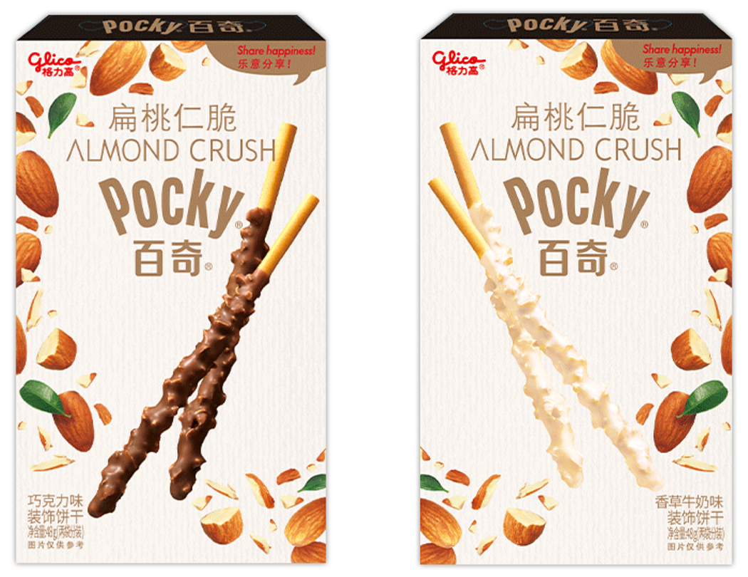 Untuk region China, Pocky varian Almond Crush ini punya dua jenis yang berbeda. Satu sama seperti pada region yang lainnya, sedangkan satu lagi dibalut dengan vanila dan milk cream. Untuk kemasannya sendiri cukup berbeda dengan yang lainnya. Almond Crush versi China memiliki kemasan bernuansa putih dan lebih menonjolkan produknya, dibandingkan dengan kacang almonnya.