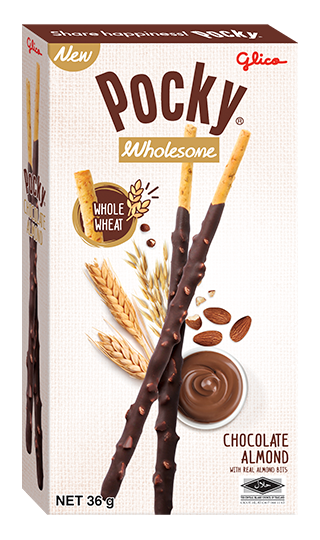 Berbeda dengan kemasan dari varian Pocky Almond Crush yang terasa eksklusif serta isinya yang dibagi menjadi dua pak yang berbeda dalam satu bungkus, Pocky varian Wholesome Chocolate Almond ini memiliki tampilan serta tekstur kemasan yang sangat berbeda dengan varian Pocky lainnya. Dengan mengambil kata “Wholesome” sebagai fokus utamanya, nuansa kemasan dari Pocky varian ini lebih meng-highlight produk dan fokus utamanya yaitu, gandum, coklat, dan kacang almon. Kemasannya juga lebih bertekstur seperti kertas, tidak semulus varian Pocky lain. Merk “Pocky” dan tulisan “Wholesome”-nya pun dibuat bertekstur dan berkilau, berbeda dengan kemasan Almond Crush yang mulus, tidak bertekstur, dan licin. Pocky varian Wholesome Chocolate Almond ini hanya bisa ditemukan di negara Malaysia, Filipina, Singapura, Thailand, dan Vietnam serta tidak memiliki perbedaan dalam kemasan di setiap wilayah.